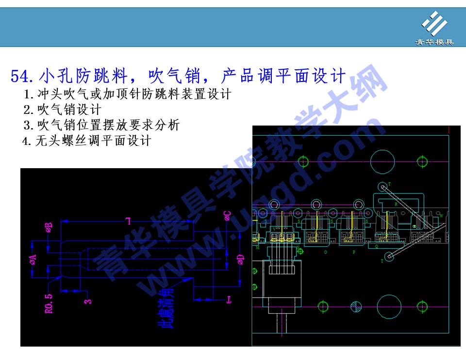 • 首页>课程大纲 >五金模具设计>五金模具设计第三阶段 >54.小孔防跳料,吹气销,产品调平面设计