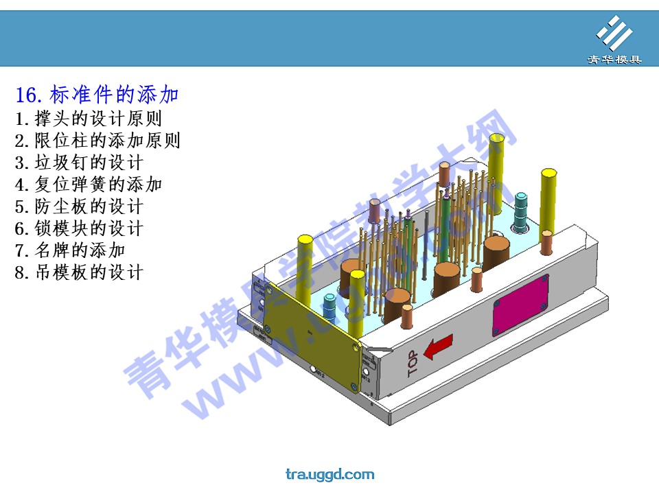 • 首页>课程大纲 >塑胶模具设计>UG塑胶模具设计第一阶段 >16.标准件的添加