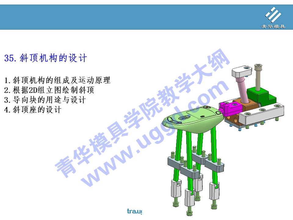 • 首页>课程大纲 >塑胶模具设计>UG塑胶模具设计第二阶段 >35.斜顶机构的设计