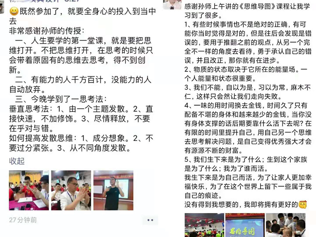 在课程进行到讲解“发散思维”、“ 水平思维”、“垂直思维”时,孙师把高纬度的信息以深入浅出的方式传递出来,让听众在不同程度受到启发,乃至醍醐灌顶般开悟!